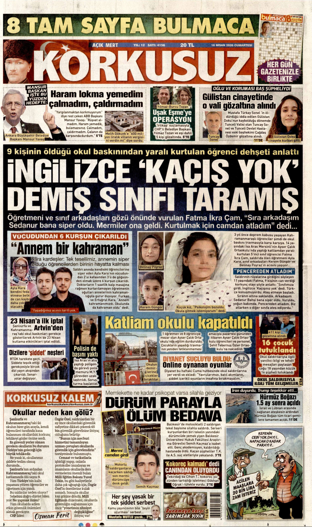 KORKUSUZ Gazetesi 18 Nisan 2026, Cumartesi Günü Manşeti